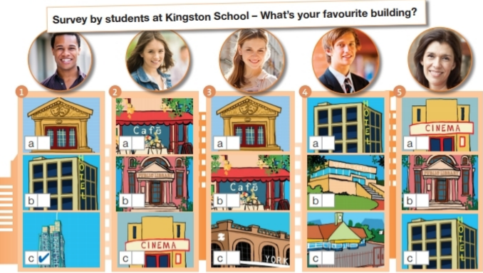 (Nghe cuộc phỏng vấn đường phố và đánh dấu vào ô đúng. Tòa nhà yêu thích của người đó là gì?)