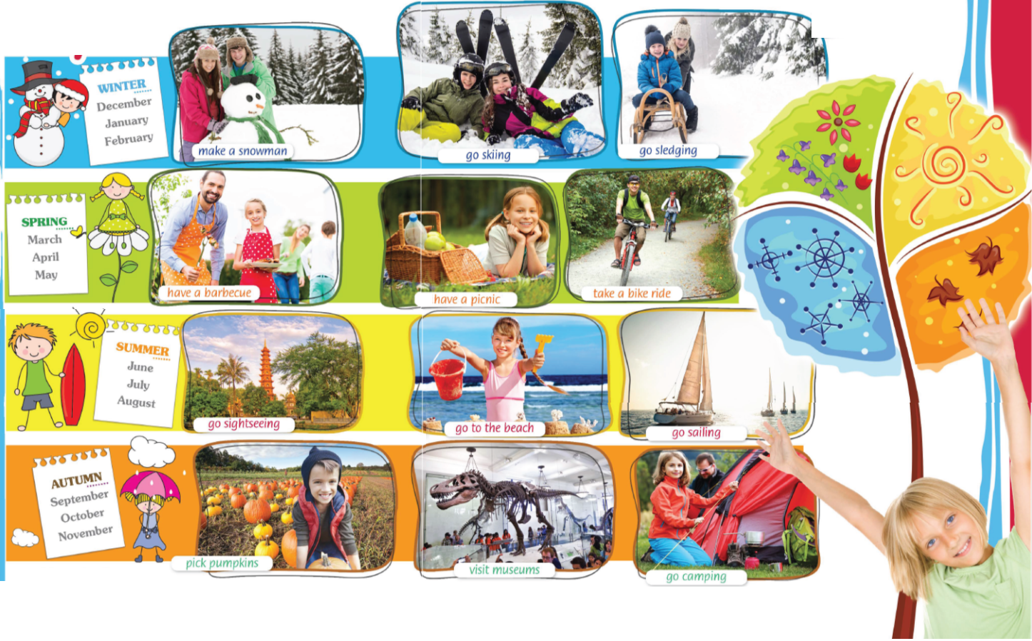 1. Listen and repeat. What are the seasons in your country? In Australia? 2. Write the missing months. 3. Which of the activities in the pictures do/don't you like doing? Discuss as in the example.