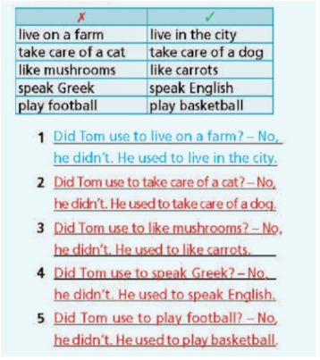 (Nhìn vào bảng. Với câu hỏi và câu trả lời về Tom lúc anh ấy năm tuổi như ví dụ. Sử dụng used to hoặc didn’t used to.)