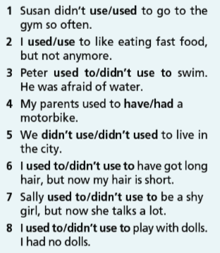 26. Choose the correct option. 27. Put the verb in brackets into the Past simple. 28. Complete the dialogue with the Past simple of the verbs in brackets. 29a. Complete the text with the Past simple of the verbs in brackets. 29b. Form questions about the text. Then answer them. 30.Use the correct option. 31. Choose the correct option. 32. Complete the sentences with used to and the verbs in brackets. 33. Look at the table. With questions and answers about Tom when he was five as in the example.