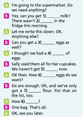 (Hoàn thành đoạn hội thoại với any (X2), some, few, little, lot, much, và many.)