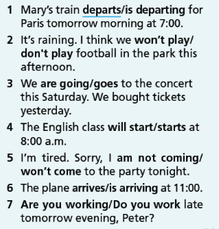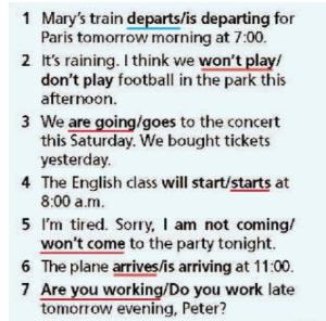 38. Fill in each gap with will or won’t. 39. Complete the sentences with the correct form of will and the verbs in brackets. 40. Jane is planning her weekend. Look at her notebook and write what she is/isn’t going to do as in the example. 41. Complete the exchanges with the correct form of will or be going to and the verbs in brackets. 42. Choose the correct option. 43. Read the email and put the verbs in brackets in the correct future form. 44. Put the verb in brackets into the Present Simple o