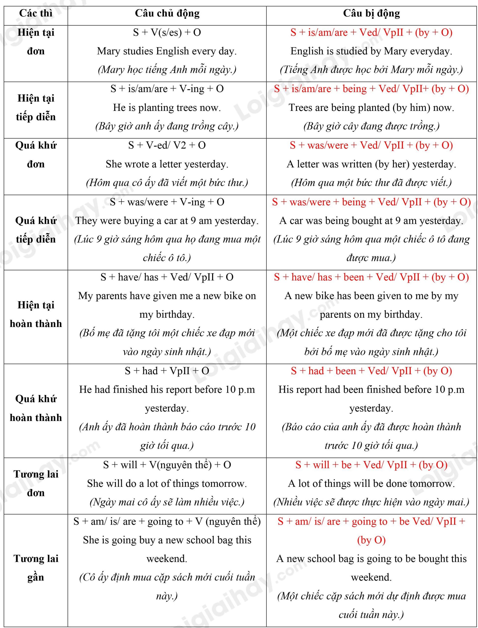 Công thức bị động các thì cơ bản: