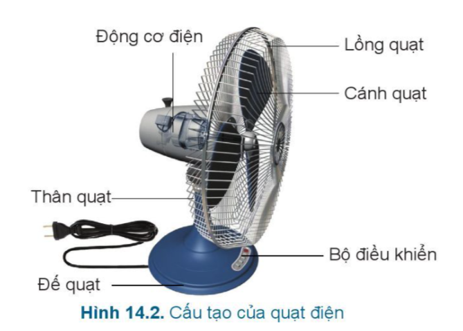 Hãy cho biết chức năng của các bộ phận cấu tạo lên quạt điện Hình 14.2.