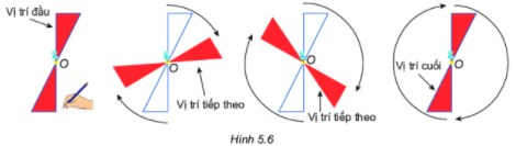 Đặt chiếc chong chóng màu đỏ có hai cánh trên mặt giấy. Dùng bút màu xanh tô theo viền của chong chóng để đánh dấu vị trí ban đầu của nó và ghim chong chóng tại điểm O (màu vàng). Quan sát chong chóng quay xung quanh điểm O như dưới đây (h.5.6).