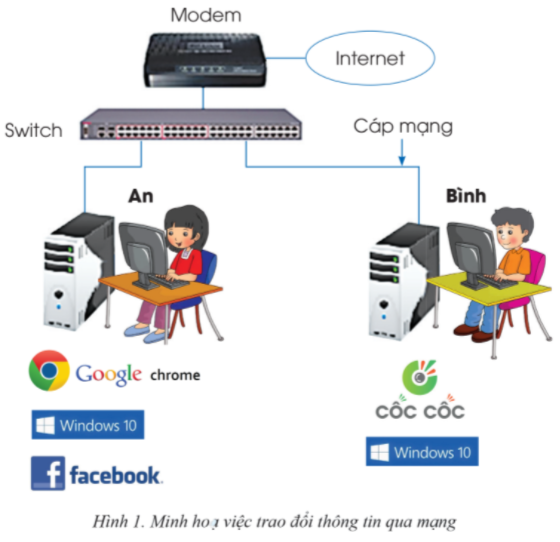 Trong hình 1, tại phòng máy tính của trường, An đang chat với bạn qua mạng xã hội còn Bình đang gửi email. Em hãy chỉ ra những máy tính, thiết bị và phần mềm đang phục vụ hai bạn.