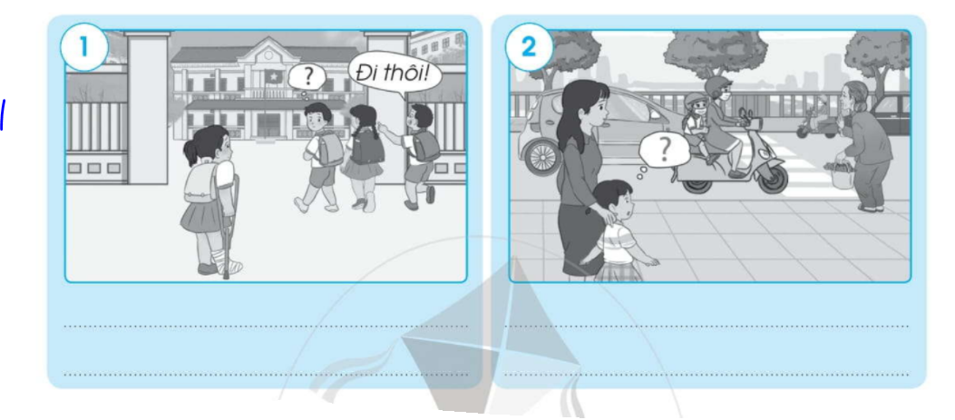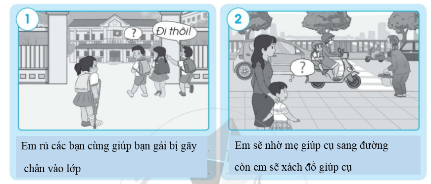- Nhìn vào tranh em cảm thấy/ suy ra các nhân vật này đang gặp phải những bất tiện gì? Nếu gặp họ ngoài đời, em sẽ làm gì để giúp đỡ họ?