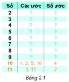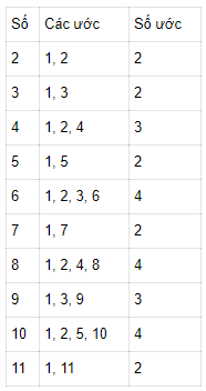 Tìm các ước và số ước của các số trong bảng bên
