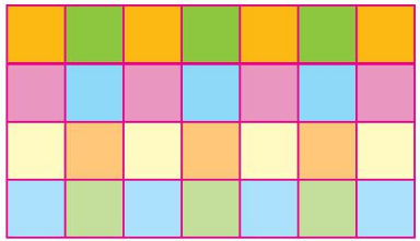 - Mỗi nhóm sử dụng thước kẻ, bút để chia hết tờ giấy hình chữ nhật đã chuẩn bị thành các hình vuông bằng nhau (mỗi hình vuông có độ dài cạnh bằng ƯCLN(28,16) xăng-ti-mét), sau đó tô màu sao cho hai ô liền nhau không cùng màu (xem hình minh hoạ).