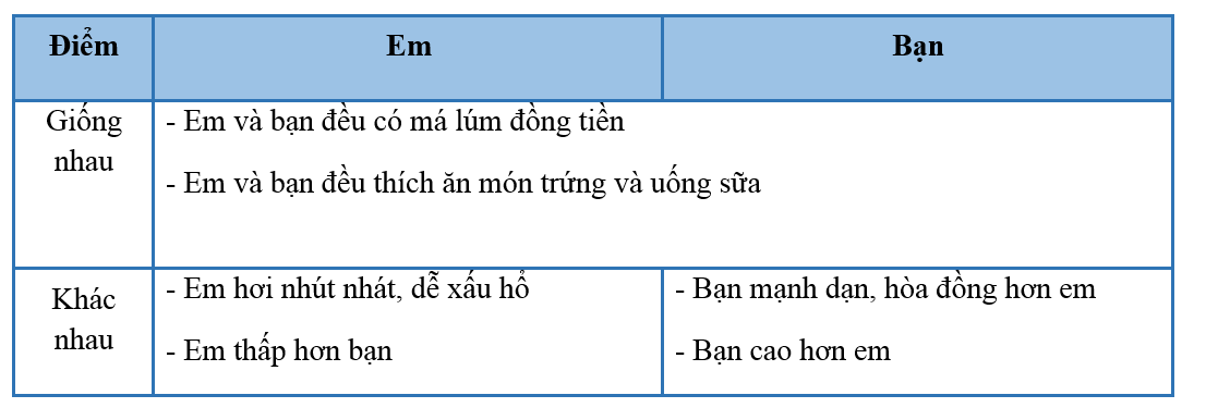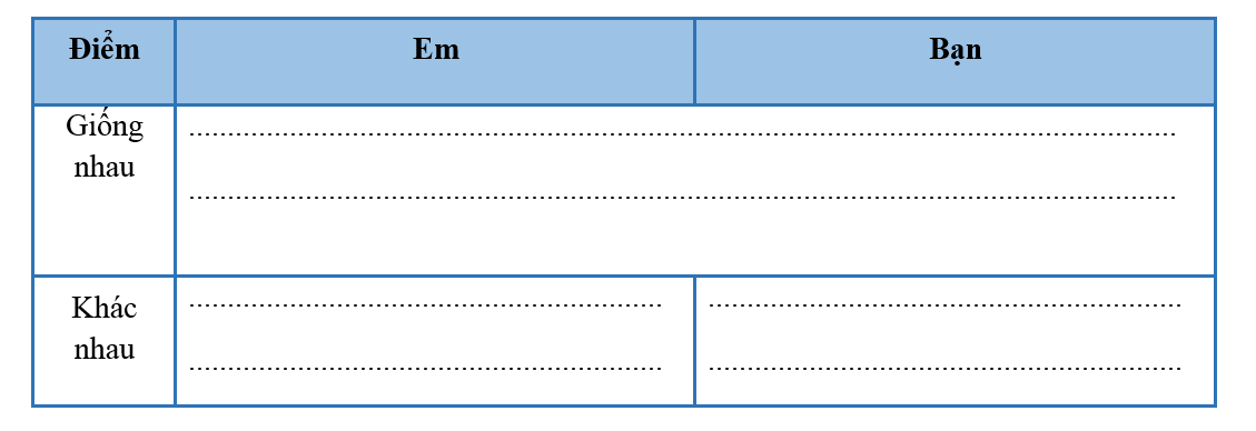 Em hãy trao đổi với bạn ngồi cạnh để tìm những điểm giống và khác nhau giữa em và bạn (về ngoại hình, tính cách, sở thích...) rồi ghi vào bảng sau: