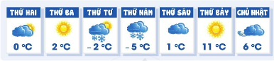 Bản tin dự báo thời tiết dưới đây cho biết nhiệt độ thấp nhất ở thành phố Niu Oóc (New York) trong các ngày từ 06/01/2020 (thứ Hai) đến 12/01/2020 (Chủ nhật).
