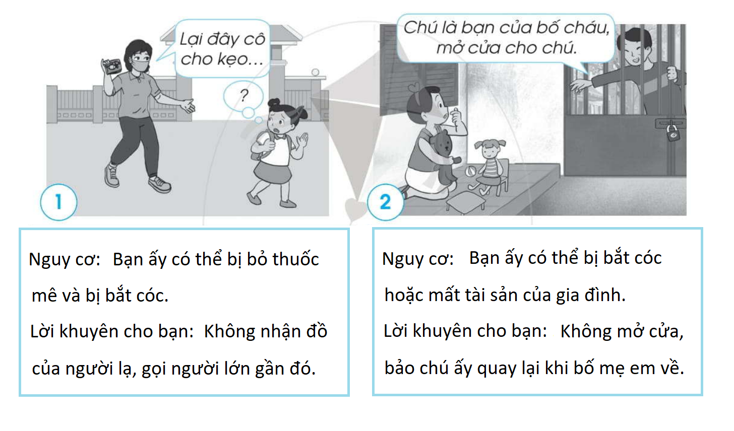 Bạn nhỏ trong mỗi tình huống dưới đây gặp phải những nguy cơ nào? Em hãy đưa ra lời khuyên cho bạn.