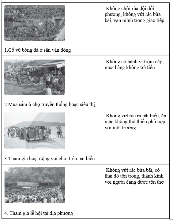 Viết những hành vi văn minh nên có trong các không gian công cộng sau:1.Cổ vũ bóng đá ở sân vận động 2.Mua sắm ở chợ truyền thống hoặc siêu thị 3.Tham gia hoạt động vui chơi trên bãi biển 4. Tham gia lễ hội tại địa phương