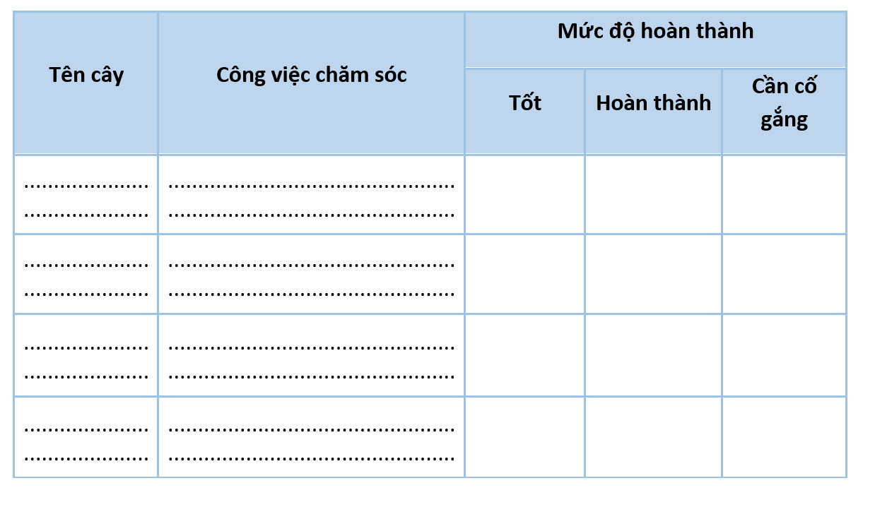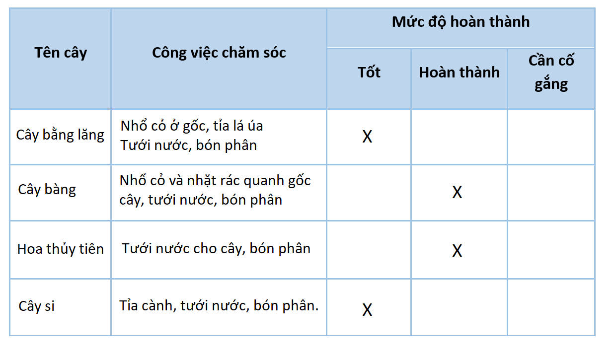 Em hãy ghi lại kết quả thực hiện kế hoạch chăm sóc cây xanh vào bảng sau