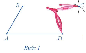 Bước 1. Lấy B làm tâm, dùng compa vẽ một phần đường tròn có bán kính AD. Lấy D làm tâm, dùng compa vẽ một phần đường tròn có bán kính AB. Gọi C là giao điểm của hai phần đường tròn này.