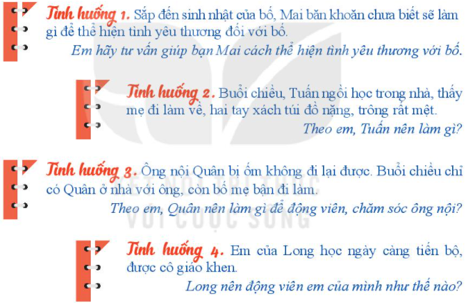 - Tình huống 1: Mai có thể cố gắng học tập thật tốt, đạt nhiều điểm 10 để bố vui. Mai có thể tự tay làm một món quà thủ công để tặng bố (một tấm thiệp, một bức tranh,...)
