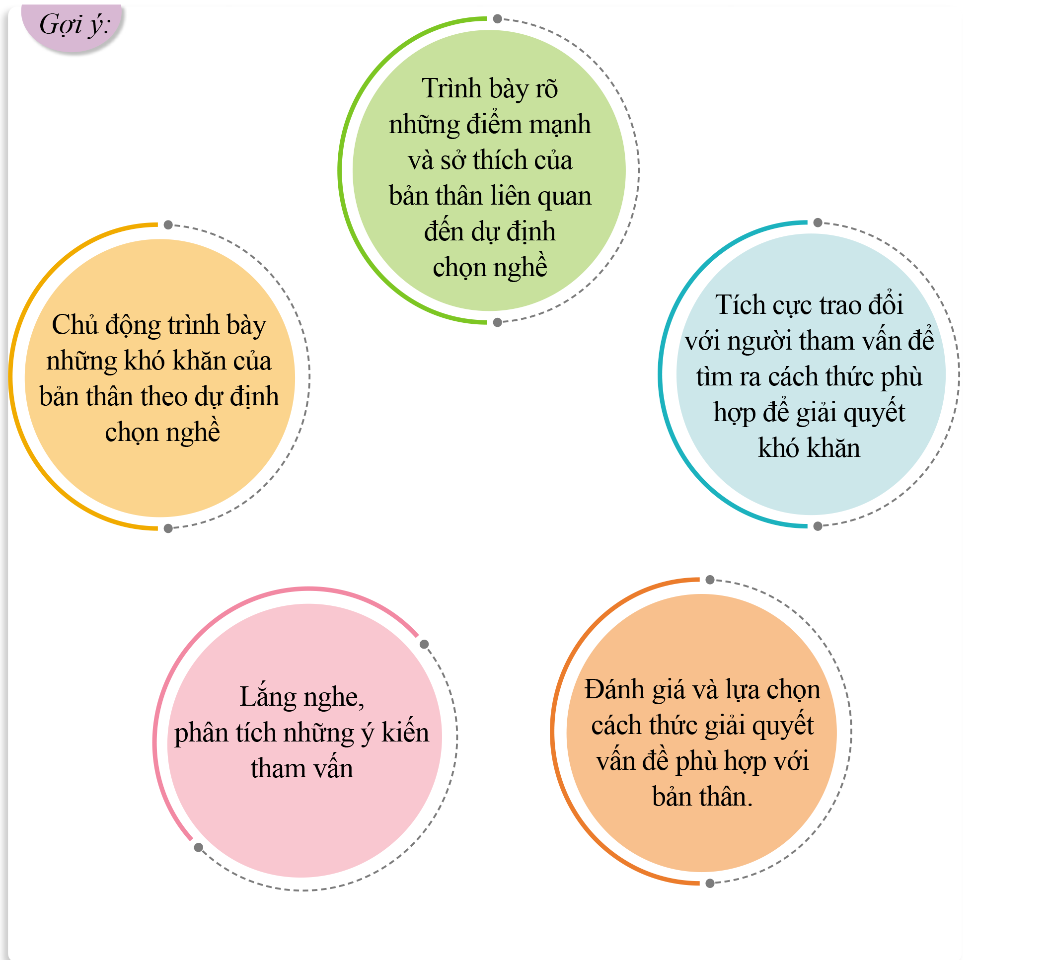 Chia sẻ dự định chọn nghề của bản thân và tham vấn ý kiến của bản thân, thầy cô, các bạn và gia đình.