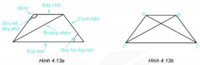 Quan sát hình thang cân ở hình 4.13a. Quan sát hình thang cân ở hình 4.13a.1. Gọi tên các đỉnh, đáy lớn, đáy nhỏ, đường chéo, cạnh bên và các góc kề đáy lớn của hình thang cân ABCD (14.13b)