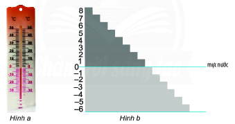 - Hãy cho biết các số chỉ nhiệt độ dưới mực số 0 có mang dấu gì. b) Quan sát Hình b, em thấy các bậc thang có độ cao mang dấu trừ thì nằm ở trên hay ở dưới mực nước?