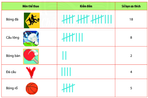 - Có 18 bạn ưa thích môn bóng đá, 8 bạn ưa thích môn cầu lông, 2 bạn ưa thích môn bóng bàn, 4 bạn ưa thích môn đá cầu và 5 bạn ưa thích môn bóng rổ.