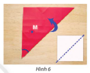 Em gấp đôi mảnh giấy hình vuông theo đường chéo (như Hình 6) để tạo thành các góc và lấy bút khoanh một cung vào góc, vẽ một điểm M trong phần giấy vừa gấp.