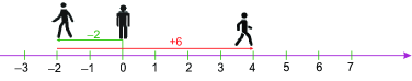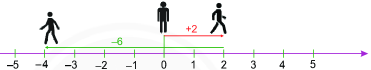 Di chuyển sang phải 2 đơn vị là \(\left( { + 2} \right)\), sang trái 6 đơn vị là \(\left( { - 6} \right)\). Người đó dừng lại tại điểm \( - 4\) nên: \(\left( { + 2} \right) + \left( { - 6} \right) = - 4\).