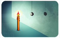 Ngọn nến, quả lắc và bóng của quả lắc ở trên tường thẳng hàng.
