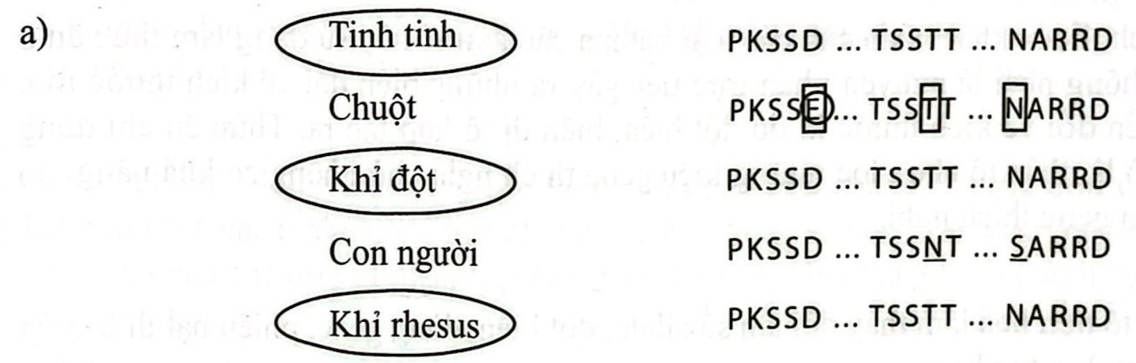 b) Có 1 sự khác biệt giữa trình tự amino acid ở chuột và trình tự amino acid ở tinh tinh, khỉ đột và khỉ rhesus. Có 2 điểm khác biệt giữa trình tự amino acid của con người và trình tự amino acid của tinh tinh, khi đột và khi rhesus.