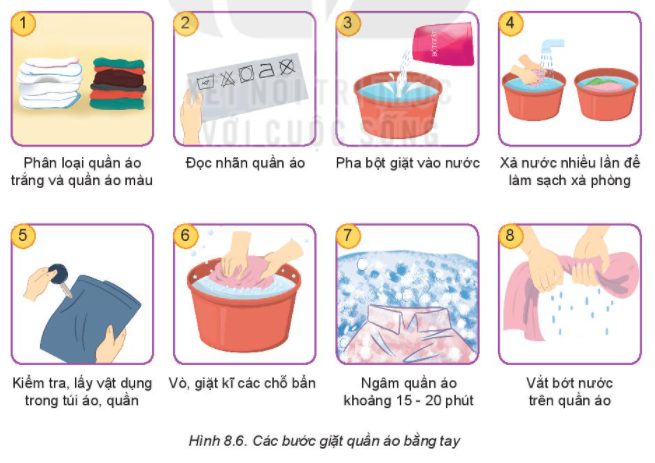 Sắp xếp các bước trong hình 8.6 theo thứ tự phù hợp với các bước giặt quần áo bằng tay.