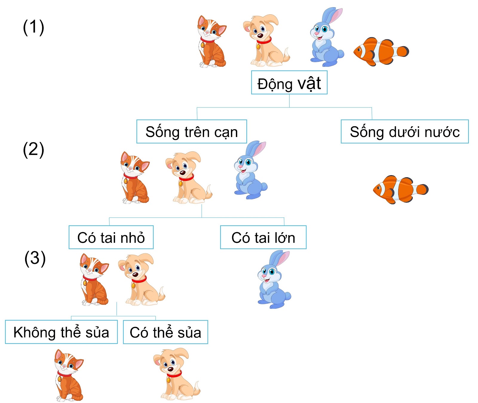 Sơ đồ phân loại mèo, chó, thỏ, cá dựa vào khóa lưỡng phân