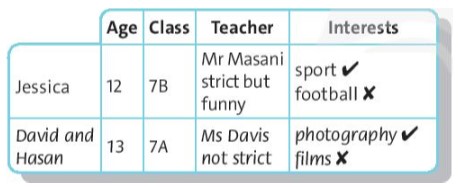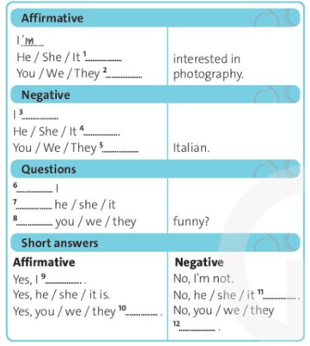 Our names (8) are David and Hasan and we (9) are thirteen. At school, we (10) are in class 7A. Our teacher (11) is Ms Davis - she (12) isn’t very strict. We (13) are interested in photography, but we (14) aren’t interested films.
