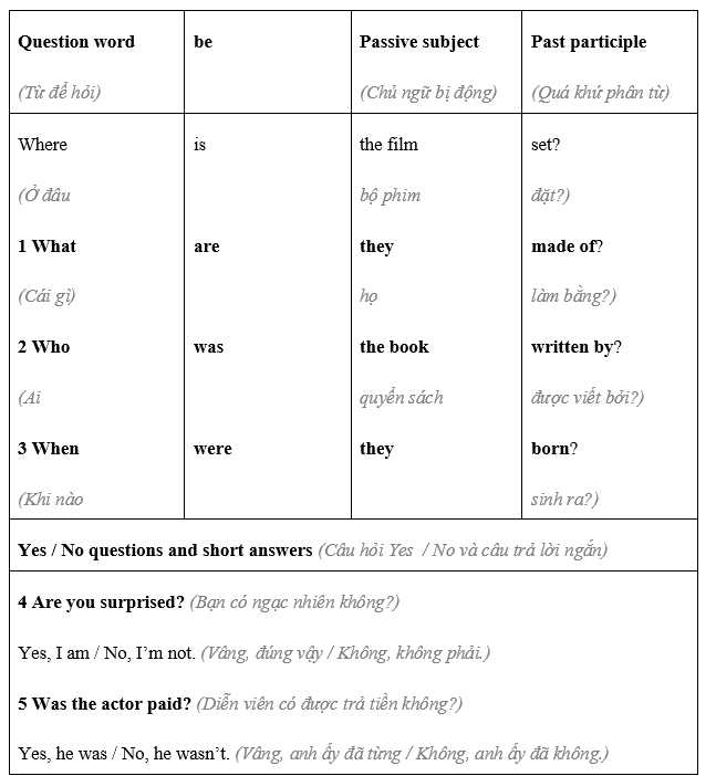 (Hãy tưởng tượng bạn sắp phỏng vấn một ngôi sao về bộ phim mới nhất của anh ấy/cô ấy. Viết năm câu hỏi sử dụng thì hiện tại và quá khứ bị động.)