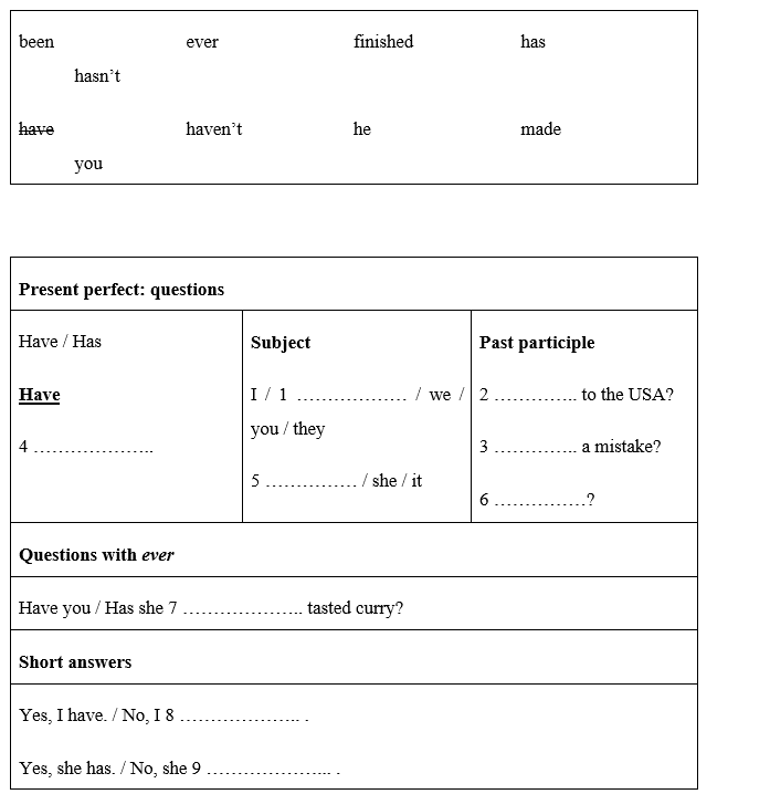 1 Complete the table with the words. 2 Complete the online chat using the correct present perfect form of the verbs. 3 Correct the words. 4 Complete the min-dialogues with the present perfect or past simple form of the verbs in brackets.