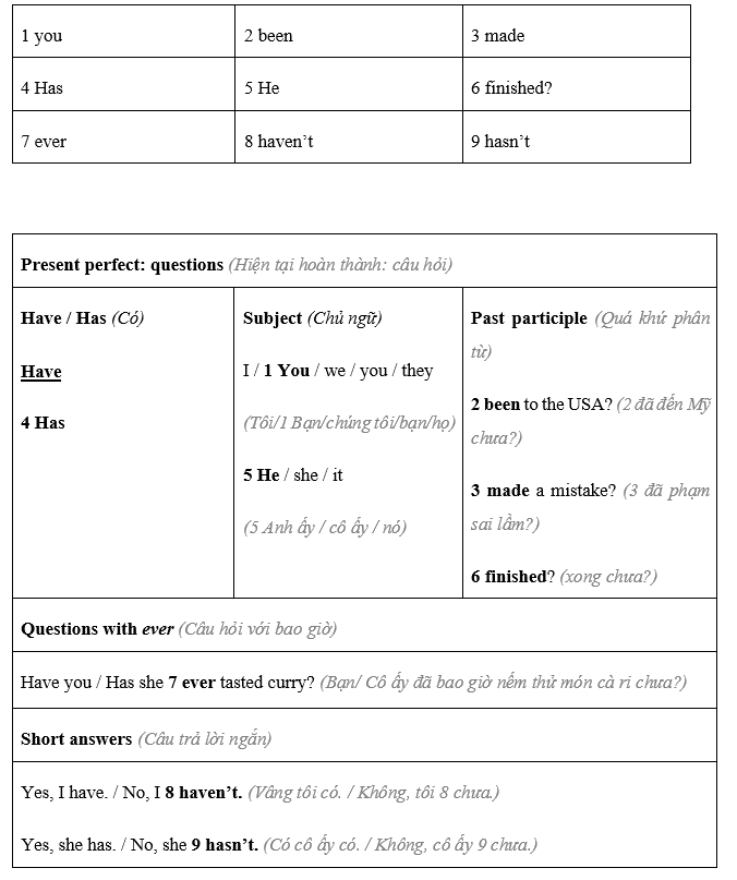 (Viết câu hỏi sử dụng thì hiện tại hoàn thành hoặc quá khứ đơn. Sau đó viết câu trả lời đúng với bạn.)