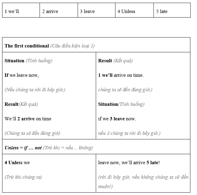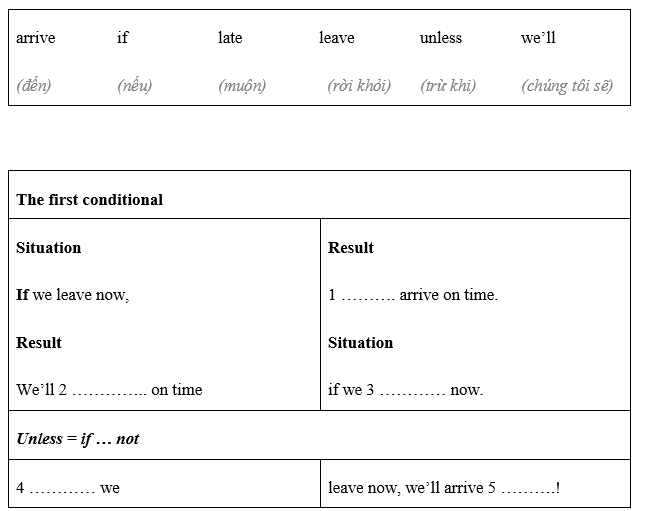 (Hãy suy nghĩ về kết quả của những sự kiện tương lai này. Viết một câu điều kiện đầu tiên với if và một câu với trừ khi.)