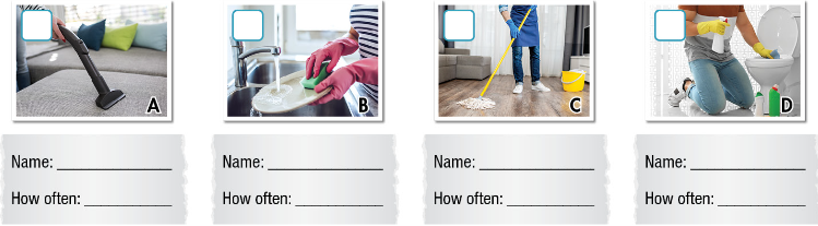 b. Now, listen and write in the name of the family member that does the chore and how often they do it.