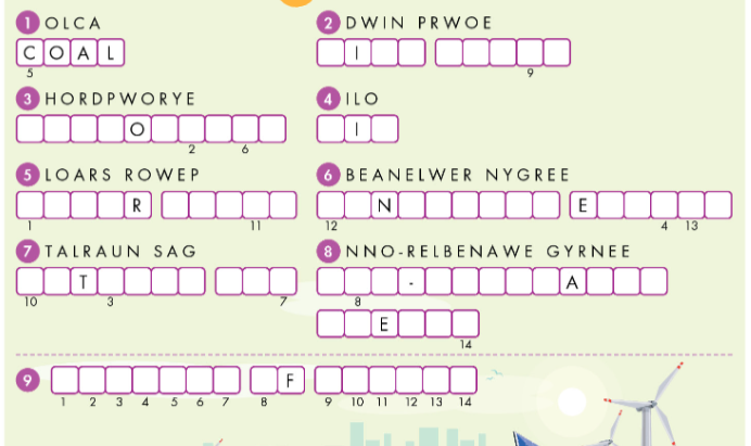 New Words Unscramble the words. Copy the letters in the numbered boxes to find the final message. Listening. a. Listen to Melissa talking to Harry. Which sources of energy does Garden City use more?. b. Now, listen and circle. Grammar: a. Look at the table and fill in the blanks with more or less. b. Write comparative sentences using the prompts and the table in Task a. Writing. Write five sentences to compare Blue City and Sun City.