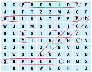 New Words a. Unscramble the words. b. Find the words from Task a. in the word search.Listening a. Listen to Alice and Stu talking about a charity.b. Now, listen and circle the correct answers. An example has been done for you. Grammar a. Fill in the blanks with the correct form of the verbs in the brackets. Practice saying the sentences.b. Rewrite the Present Simple sentences in Present Continuous.Writing Look at the information and write Ben’s volunteer profile.