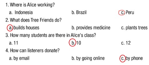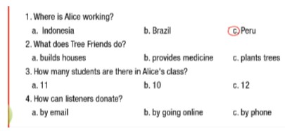 Alice: À, tôi tình nguyện cho một tổ chức từ thiện có tên là “Những người bạn trên cây”, chúng tôi làm việc ở nhiều quốc gia bao gồm Brazil, Indonesia, Ấn Độ và Cộng hòa Congo nhưng hiện tại tôi đang làm việc ở Peru.