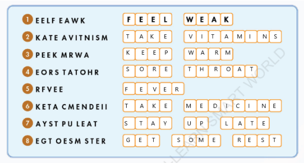 | 5. keep warm | 6. sore throat | 7. stay up late | 8. get some rest |