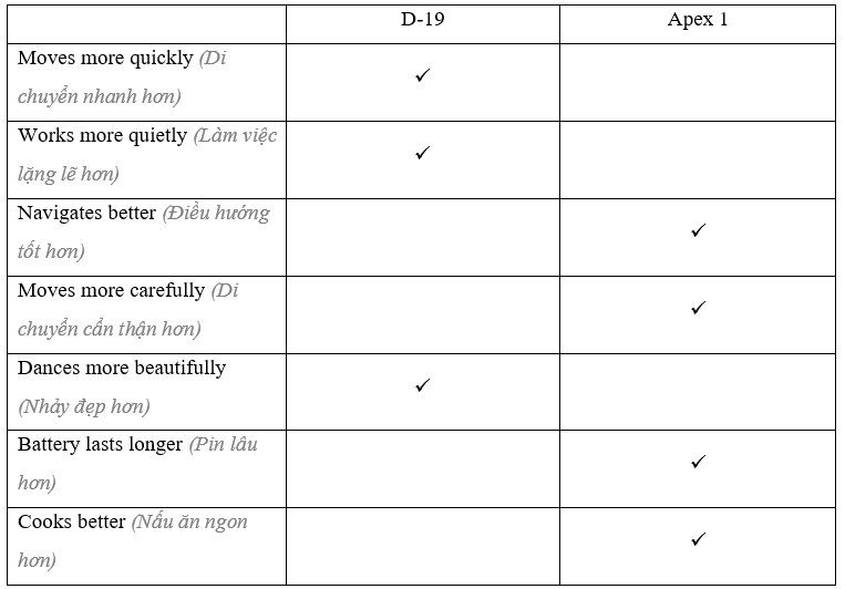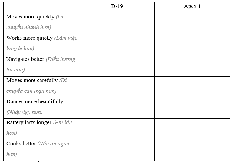 (Nhìn vào thông tin. Viết năm câu so sánh hai robot.)