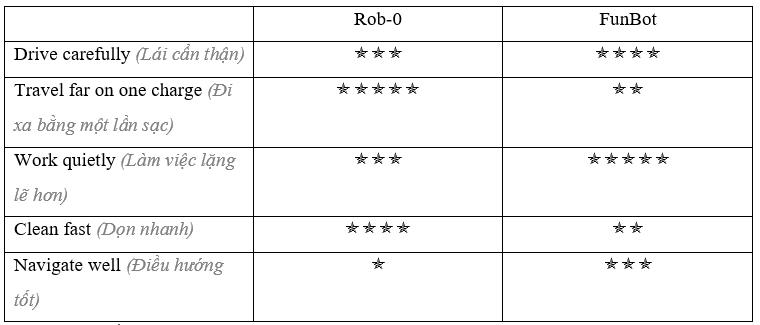 Rob-0 travels further on one charge than FunBot. (Rob-0 di chuyển xa hơn trong một lần sạc so với FunBot.)