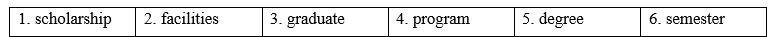 1. e: scholarship – money given by an organization to pay for a student’s studies