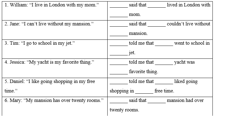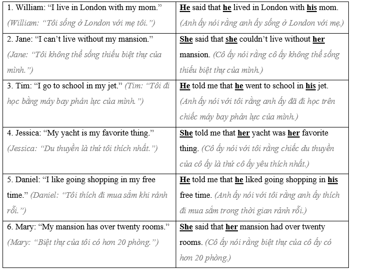 6. ✅ She told me that sometimes she lived on her yacht. (Cô ấy nói với tôi rằng đôi khi cô ấy sống trên du thuyền của mình.)