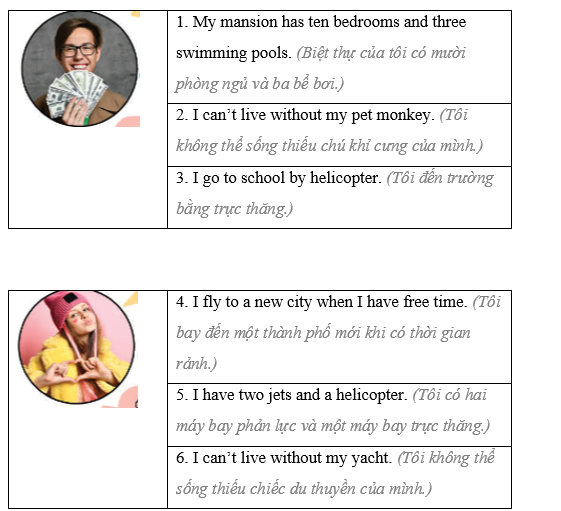 4. ✅ They said that they liked going to expensive restaurants. (Họ nói rằng họ thích đến những nhà hàng đắt tiền.)