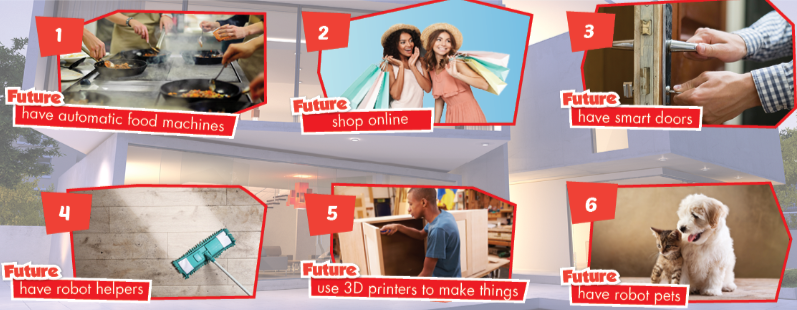 New Words a. Number the picture using the definitions. Listen and repeat. b. Say what smart devices you have in your home. Reading a. Read the article about home in the future. Is Professor Relldan excited about the future? Yes/No b. Read the article again and answer the questions. Grammar a. Listen and repeat. b. Fill in the blanks using “might” and a verb from the box. c. Unscramble the sentences. d. Now, practice saying sentences with your patner.