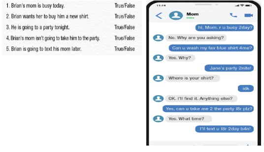 Listening a. Listen to a girl talking to her grandfather about text language. How many words did the girl explain?b. Now, listen and fill in the blanks.Reading a. Write the text language in the box next to its meaning.b. Read the text from Brian to his mom and circle True and False.Writing Skill