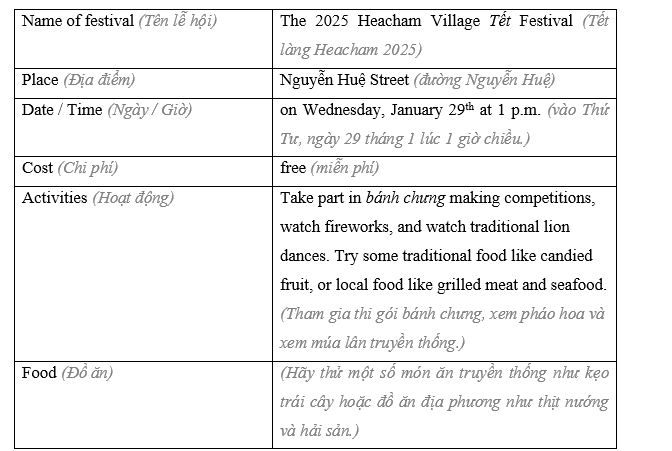 (Bây giờ, hãy tưởng tượng bạn là thành viên của ban văn hóa của một thị trấn nhỏ trong nước và đang lên kế hoạch cho một lễ hội truyền thống. Chọn một lễ hội và hoàn thành bảng.)
