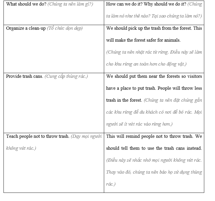 Chúng ta nên nhặt rác từ rừng. Điều này sẽ làm cho khu rừng an toàn hơn cho động vật.