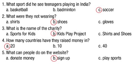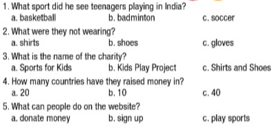 1. What sport did he see teenagers playing in India? c. soccer